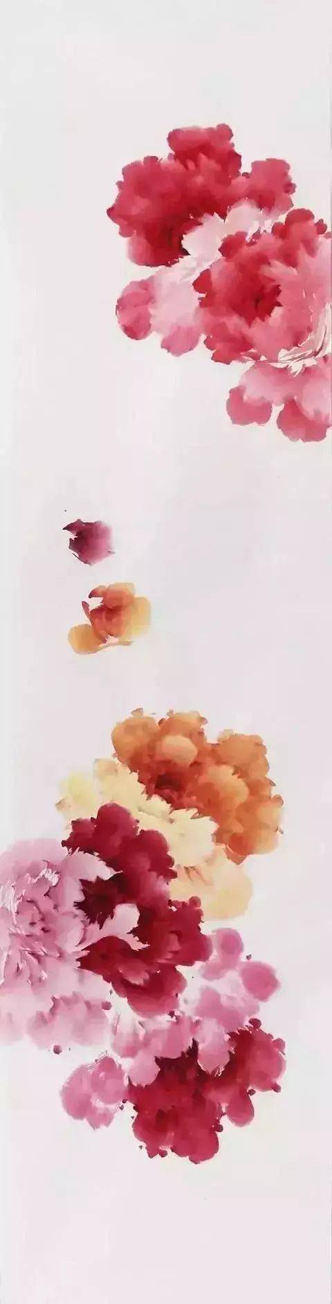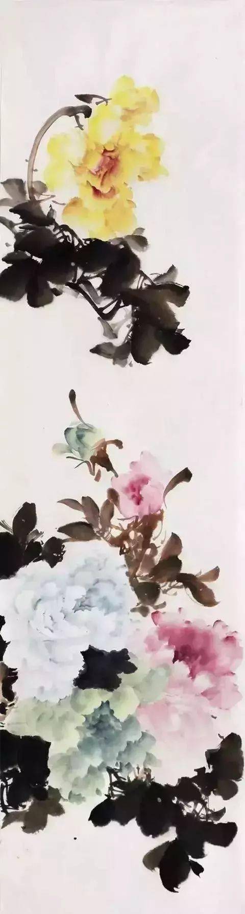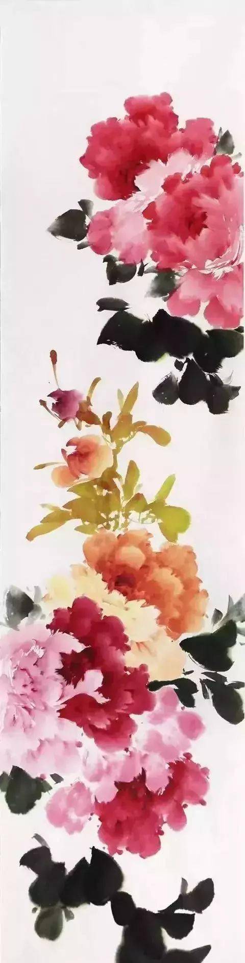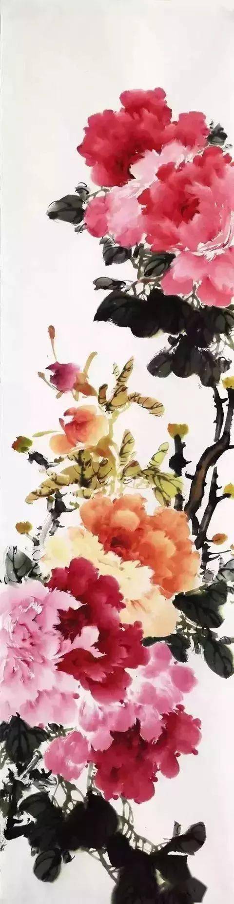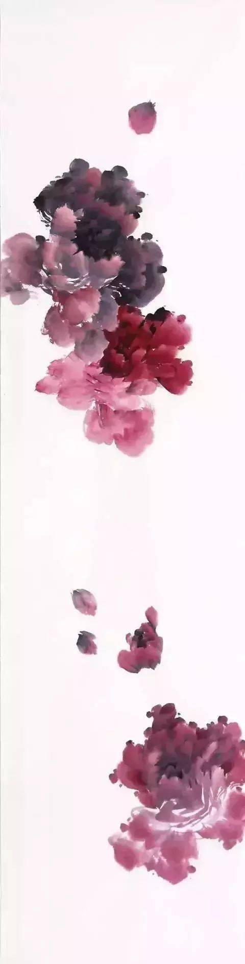 牡丹花头用二号、三号羊毫斗笔,上方深紫色花头用胭脂加墨,侧方花头曙红加少许墨,下方花头与上方花头颜色相同稍淡些,均以前淡后浓根据花型点写而成,注意花头的相互呼应及留出飞白。最后根据画面疏密点出花苞。
