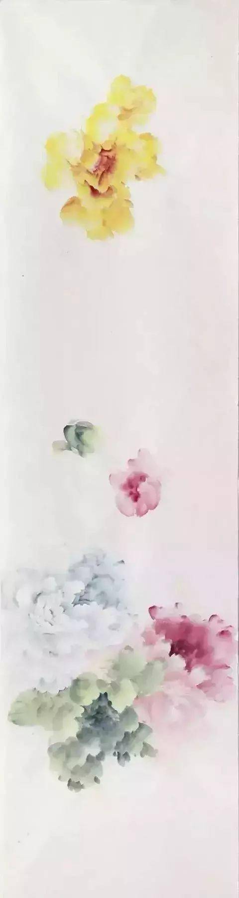 下方的浅红花头绘制笔法同上方,反瓣颜色以白粉调曙红为之,正瓣颜色笔肚曙红,笔尖蘸胭脂点厾笔法绘制,最暗处笔尖调和中墨点写。黄色花头:反瓣笔肚白粉,笔尖藤黄。正瓣在反瓣原有的基础上,笔尖多加曙红调和。