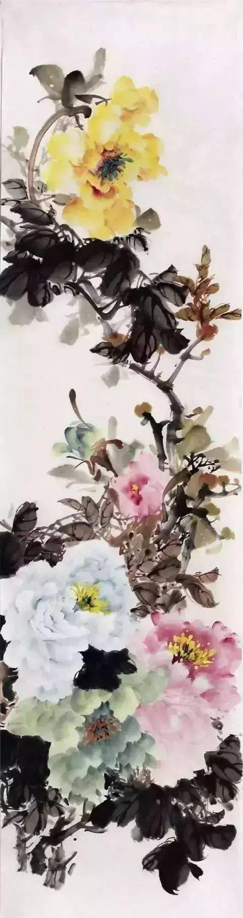 用中号羊毫斗笔蘸稍许白粉、淡藤黄、淡花青画出牡丹花头的反瓣,然后加浓墨画正瓣。注意牡丹花头正瓣与反瓣的深浅变化。